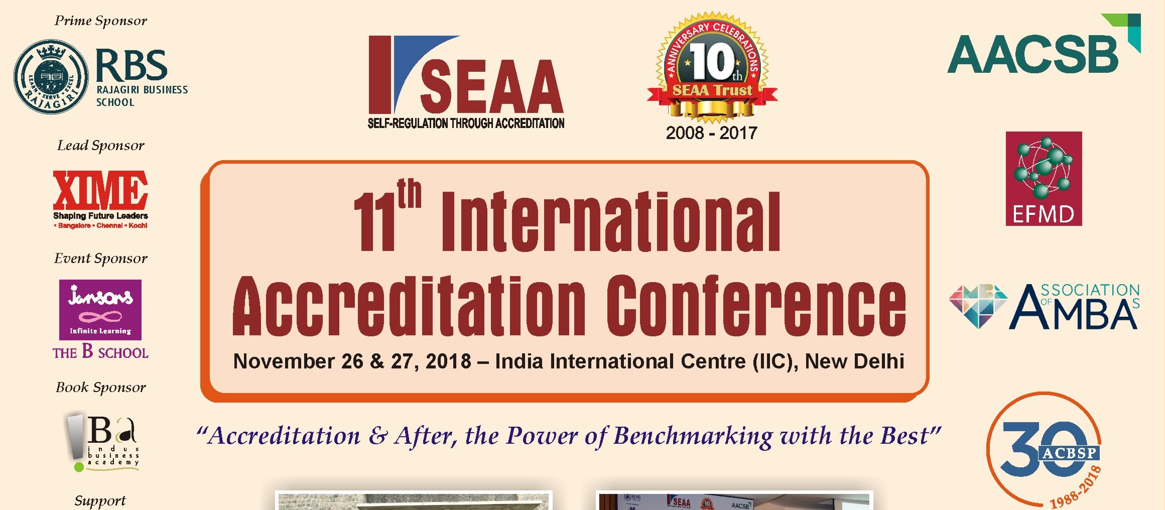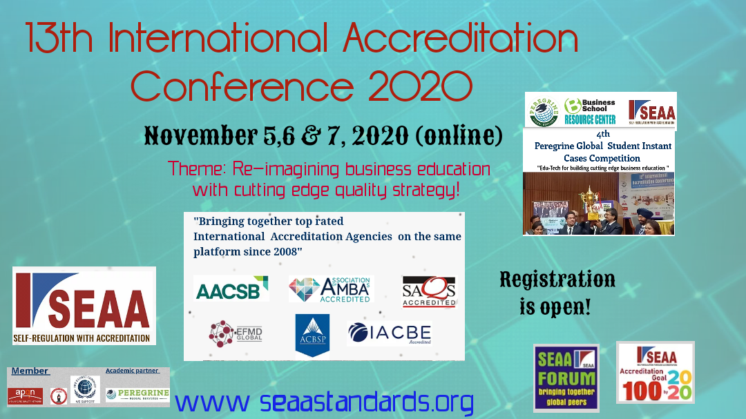 Standards for Educational Advancement & Accreditation (SEAA) Trust, New Delhi announces its 13th Annual International Accreditation Conference on the theme "Re-imagining Business Education with cutting edge Quality Strategy" on the presumption that the recent months have fundamentally altered business education worldwide. The three days online conference would be held on November 5,6 & 7 2020. The time of the conference is TWO hours each day between 5.30 p.m. and 7.30 p.m IST. The Global conversion of the time can be found in this link